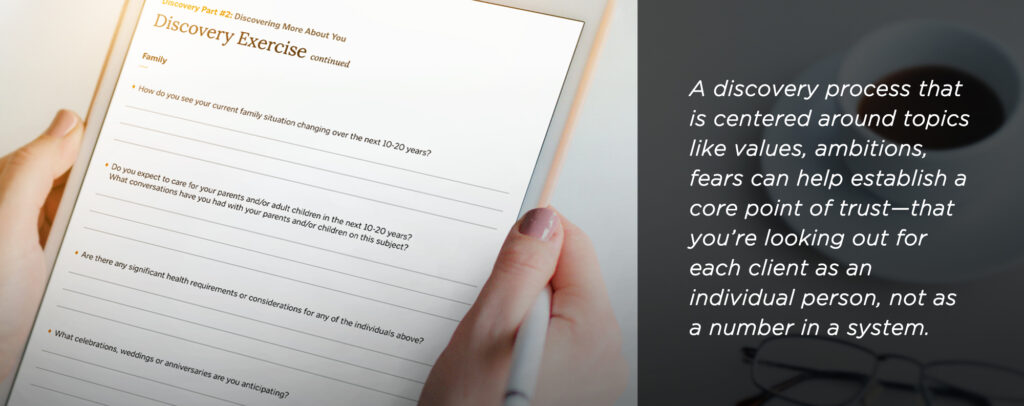 Artificial intelligence can analyze data and improve efficiency, but an experienced advisor can appreciate individual values and emotions. A discovery process that is centered around topics like values, ambitions, fears can help establish a core point of trust—that you’re looking out for each client as an individual person, not as a number in a system.
