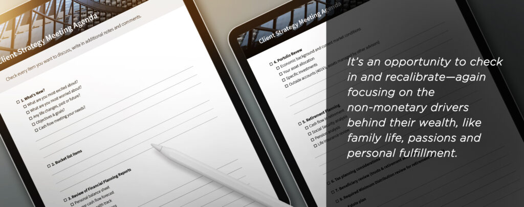 Each annual review is a retrospective on the year, but it’s also a kind of mini-discovery session. It’s an opportunity to check in and recalibrate—again focusing on the non-monetary drivers behind their wealth, like family life, passions and personal fulfillment.