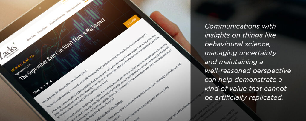 Clients want to know what’s happening in the markets and the economy, but they also need guidance on how to respond to it. Communications with insights on things like behavioural science, managing uncertainty and maintaining a well-reasoned perspective can help demonstrate a kind of value that cannot be artificially replicated.